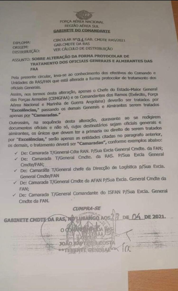 “Assim, nos termos desta alteração, apenas o Chefe do Estado-Maior General das Forças Armadas (CEMGFAA) e os comandantes dos ramos (exercito, Força Aérea e Marinha de Guerra angolana) deverão ser tratados por EXCELÊNCIAS, passando os demais generais e almirantes serem tratados apenas por CAMARADAS”, confirme se lê no circular do dia 24 de Abril, que o Club-K teve acesso.