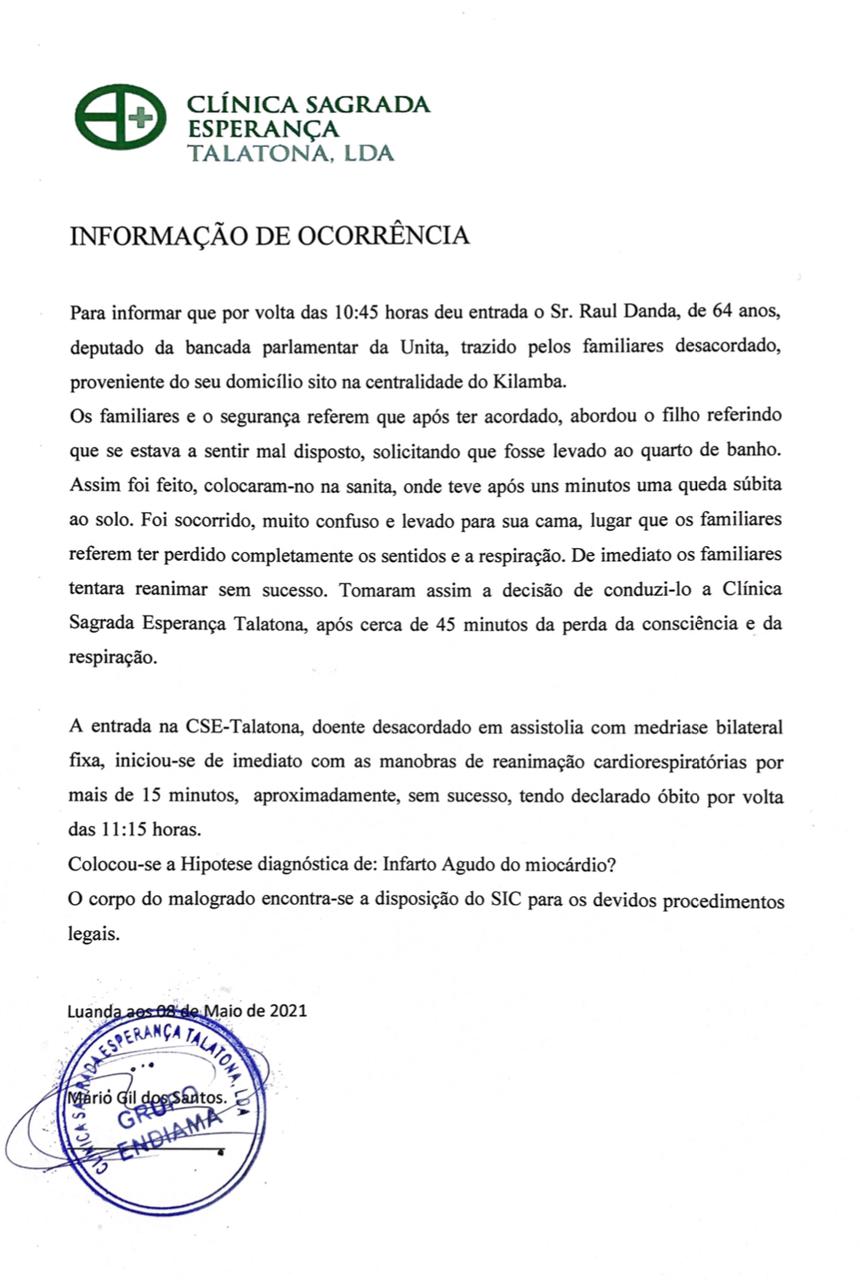 Luanda – A Clinica Sagrada Esperança de Talatona para onde o deputado Raul Manuel Danda, estaria a ser socorrido antes de perder a vida, fez uma informação ao Serviço de Investigação Criminal (SIC) detalhando aqueles que seriam os últimos minutos do também primeiro ministro do governo sombra da UNITA.