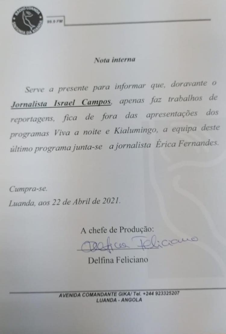 No dia seguinte, a chefe de produção da Rádio Luanda, Delfina Feliciano determinou, através de uma nota interna, que doravante o jornalista Israel Campos, passa apenas a fazer trabalhos de reportagens, ficando de fora das apresentações dos programas “Viva a Noite” e “Kialumingo”. A equipa deste último programa foi reforçada com a presença da jornalista Erica Fernandes.