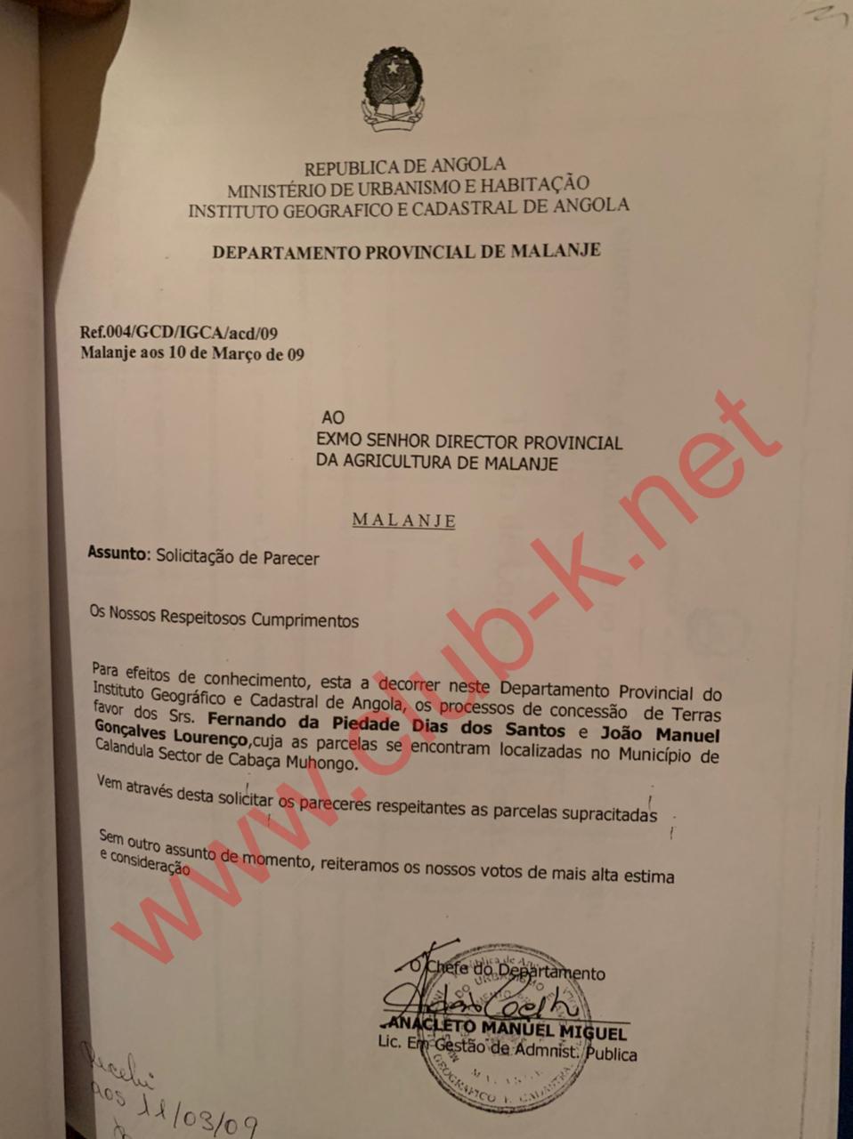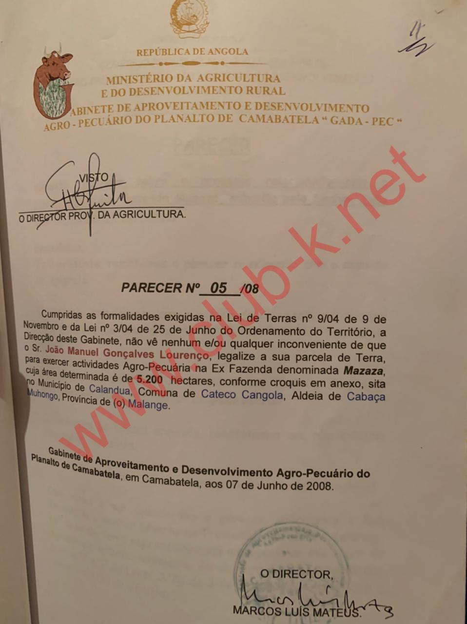 Em correspondência datada de 7 de Junho de 2008, o diretor do GADA – PEC, respondeu ao seu colega da agricultura que com base na lei de terras de então, “a direção deste gabinete, não vê nenhum inconveniente de que o Sr João Manuel Gonçalves Lourenço, legalize a sua parcela de terra, para exercer atividades agropecuárias na ex-fazenda denominada Mazaza, cita no município de Calandua, Comuna de Cateco Cangola, Aldeia de Cabaça Muhongo, província de Malanje”.